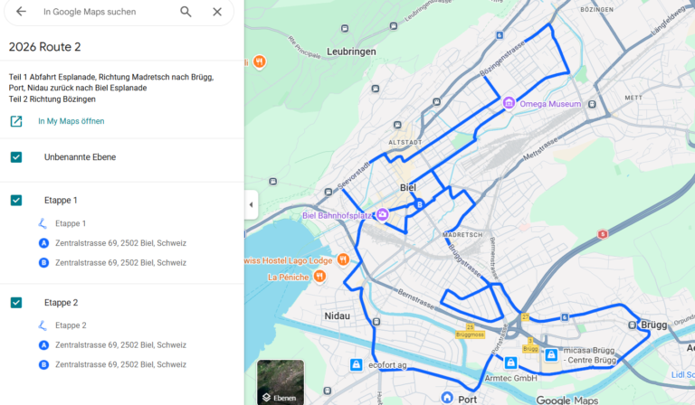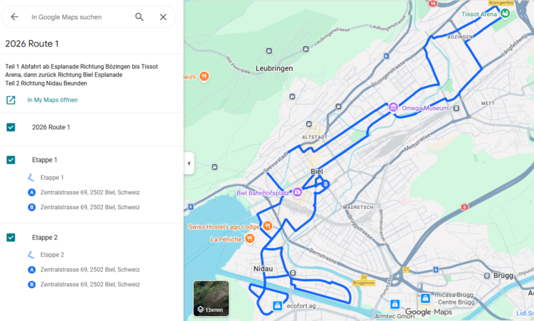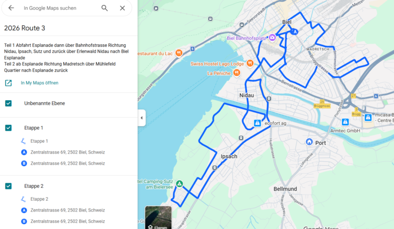 Wir fahren im Laufe der Saison drei unterschiedliche Routen. Bei Bedarf werden sie je nach Baustellenlage angepasst. Wenn du auf die jeweilige Karte klickst, wirst du zur Karte auf Google Maps geleitet. Dort kannst du links die Anzeige der Etappe 1 und 2 auswählen.